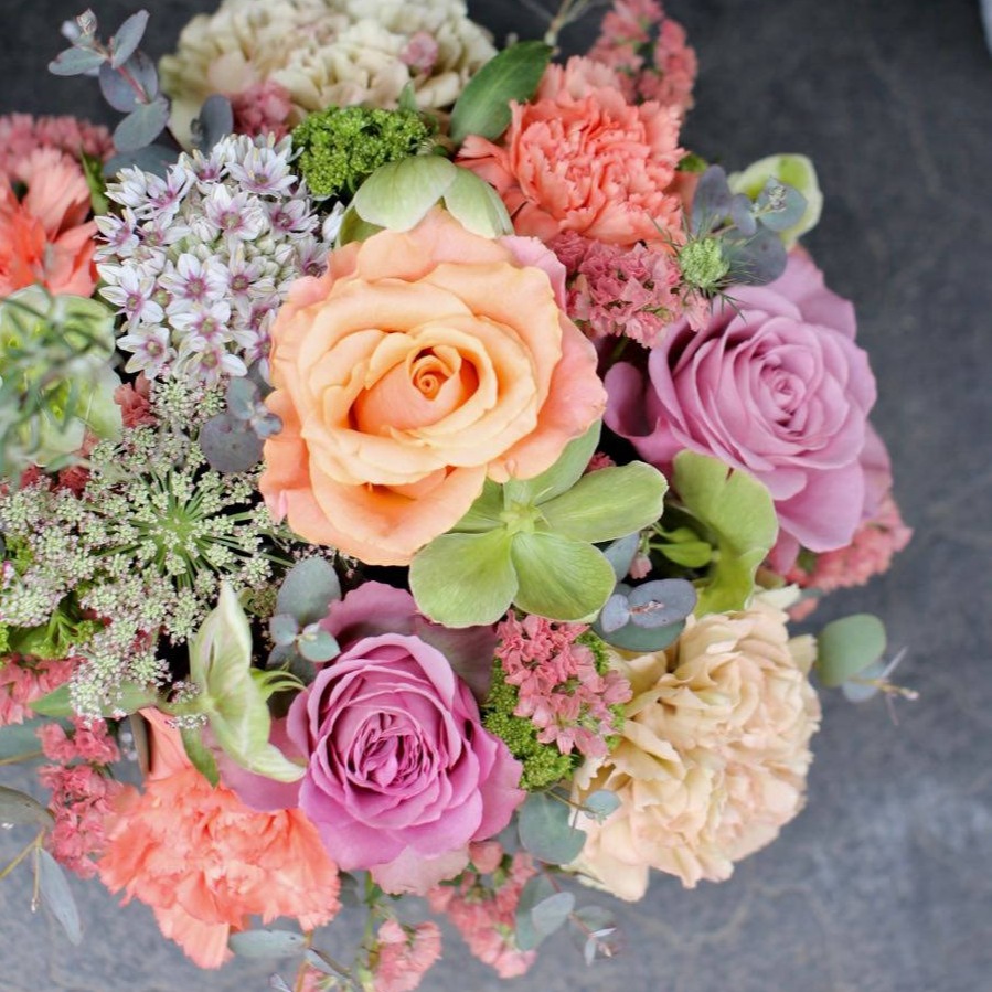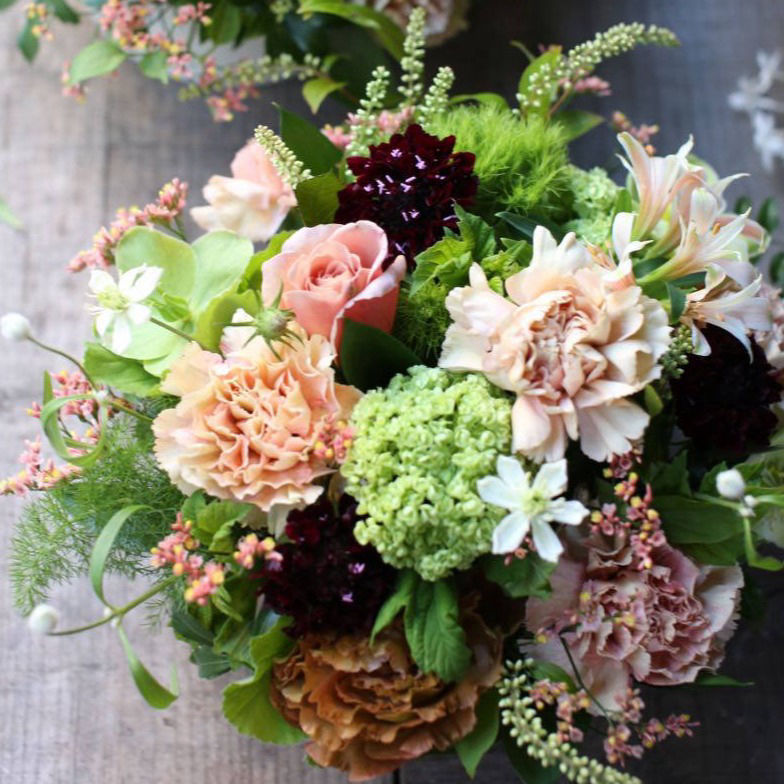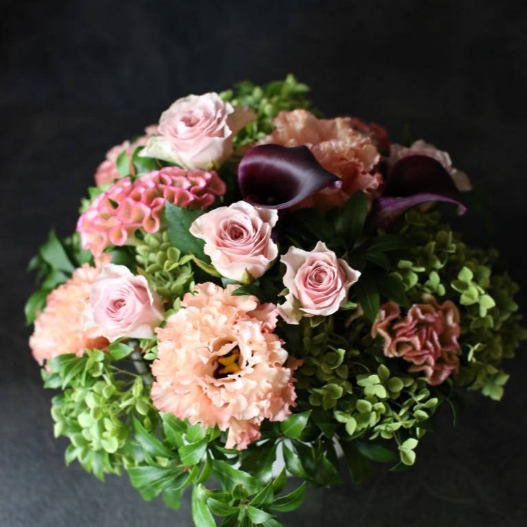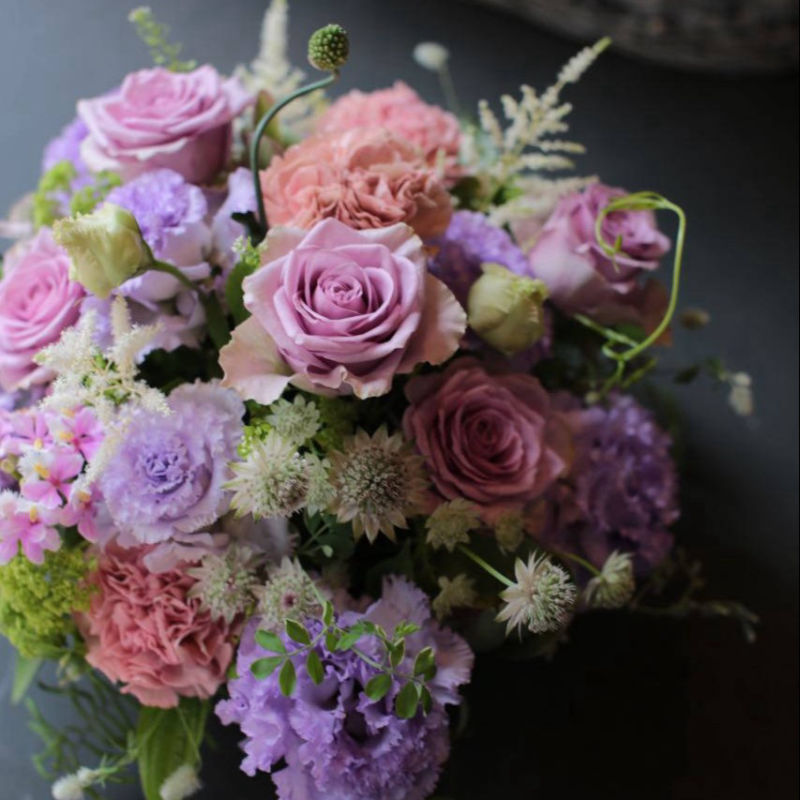 長く楽しんでいただけるようにできるだけ新鮮で状態の良いものを複数の市場から厳選し花色や品質にこだわった旬の花たちで制作いたします